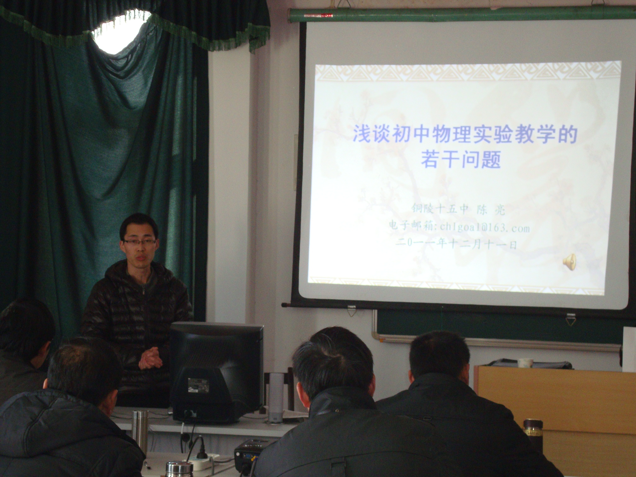 12月11日下午,铜陵市第十五中学的陈亮老师和“国培计划”初中物理短期班学员交流实验教学。陈亮老师是铜陵市“教学能手”、多次在全国自制教具比赛中获奖,参与多项教育课题的研究。