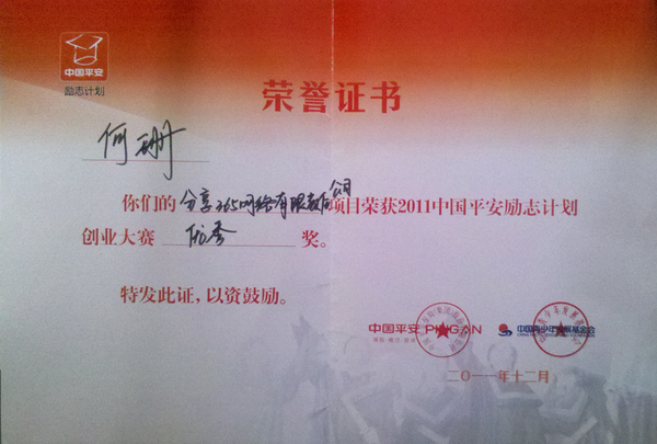近日,由中国青少年发展基金会、中国平安集团联合主办,《经济观察报》、新浪网等联合协办的2011第三届中国平安励志创业大赛总决赛在东北财经大学落下帷幕。公司员工何珊同学领衔,计算机公司、文公司员工参与的创业项目《分享365网络有限责任公司》获得本次大赛的优秀奖,并获得创业基金1000元。这是公司员工首次参加该项赛事的全国性决赛,并获得了理想成绩。