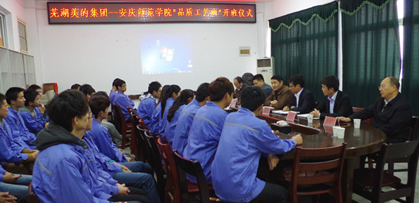 芜湖美的制冷设备有限公司是公司工科员工实习基地、人才培养基地。本次“品质工艺班”是公司与芜湖美的制冷设备有限公司在前期员工实习实践成功合作基础上双方签署的又一项战略合作协议成果。按照协议,芜湖美的将依据企业发展需求,委托安庆师范公司每年在四年级员工中优选30--50名同学进行为期三个月的企业相关工艺品质课程专项培训。授课教师全部由企业人员担任,并无偿捐赠实习实训设备。所有培训课程及管理方式全部按照企业要求进行。本班的开设主要为企业培训基层管理技术人员后备力量,同时也为公司员工搭建了直接进入大型企业管理工作岗位的快车道。( 江伟)