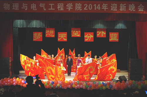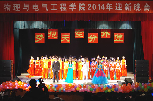 迎新晚会以“梦想天空分外蓝”为主题,分别以憧憬未来、追逐梦想、放飞希望三个篇章将精彩的表演呈现给观众,节目丰富有趣,表现精致生动,现场掌声雷动。