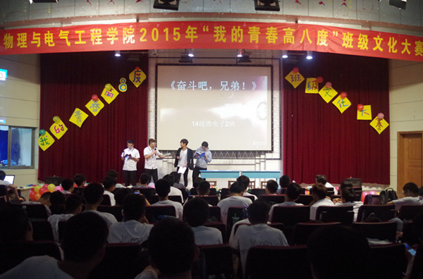 比赛在啦啦队自编的啦啦操中拉开序幕,首先进行的是班级班歌合唱,同学们激昂的歌声响彻图书馆。《天高地厚》、《年轻的战场》《明天会更好》一阵阵充满着青春朝气的歌声在场内久久回荡。2014级电信(1)班的自创歌曲《我的梦,真精彩》更是瞬间引爆了全场气氛,获得观众和评委的一致好评。在第二环节PPT展示中,各班代表充分利用PPT等多媒体技术,图文并茂地展示了本班一年以来班级团组织建设,思想纪律建设、班级学业建设及班级文体建设等各项成果,彰显出各班级团结向上的班风面貌,深厚的班级文化底蕴,以及强大的集体凝聚力。各班级更是利用各自专业知识以及创新性的思维,创作了各自独特的班徽图标,令人眼前一亮。