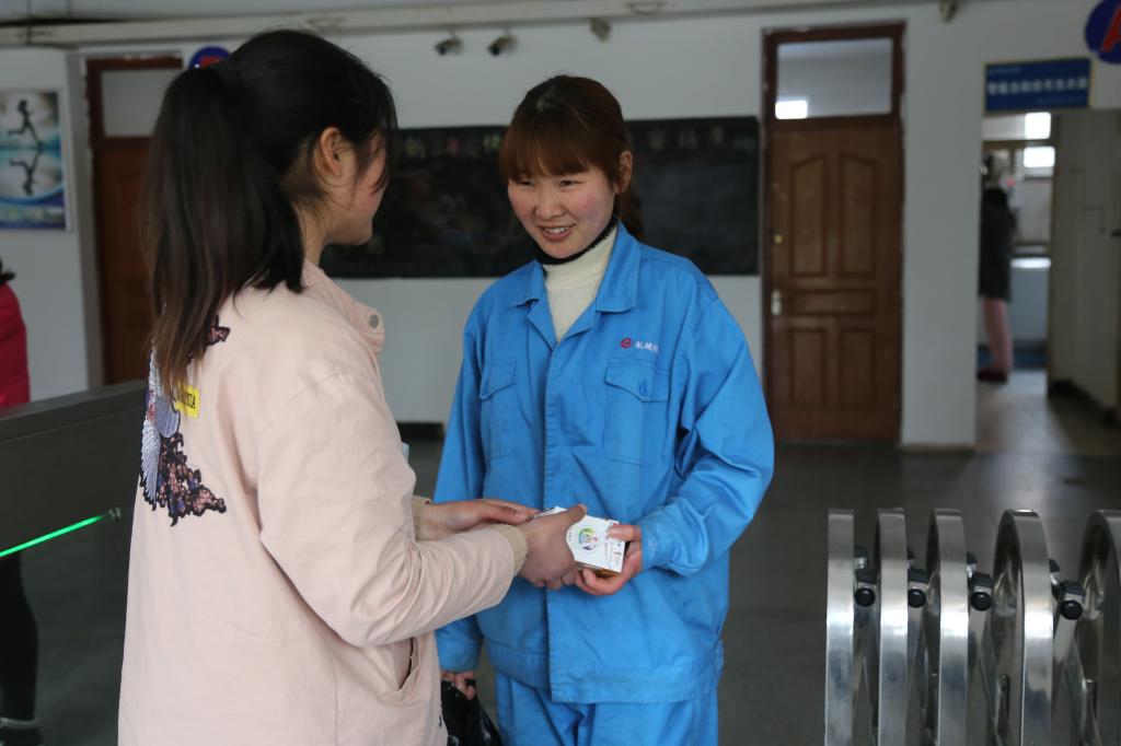 采血顺利结束后,同学们又进行另一项爱心活动,他们将领到的牛奶等慰问转送给公司里一直默默工作的保洁阿姨和保安大叔们,以表达对他们的感谢之情,希望他们能在忙碌的工作之余也收获一份温暖。
