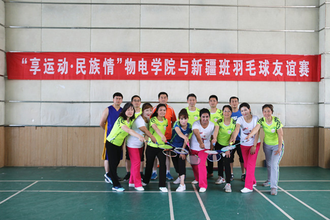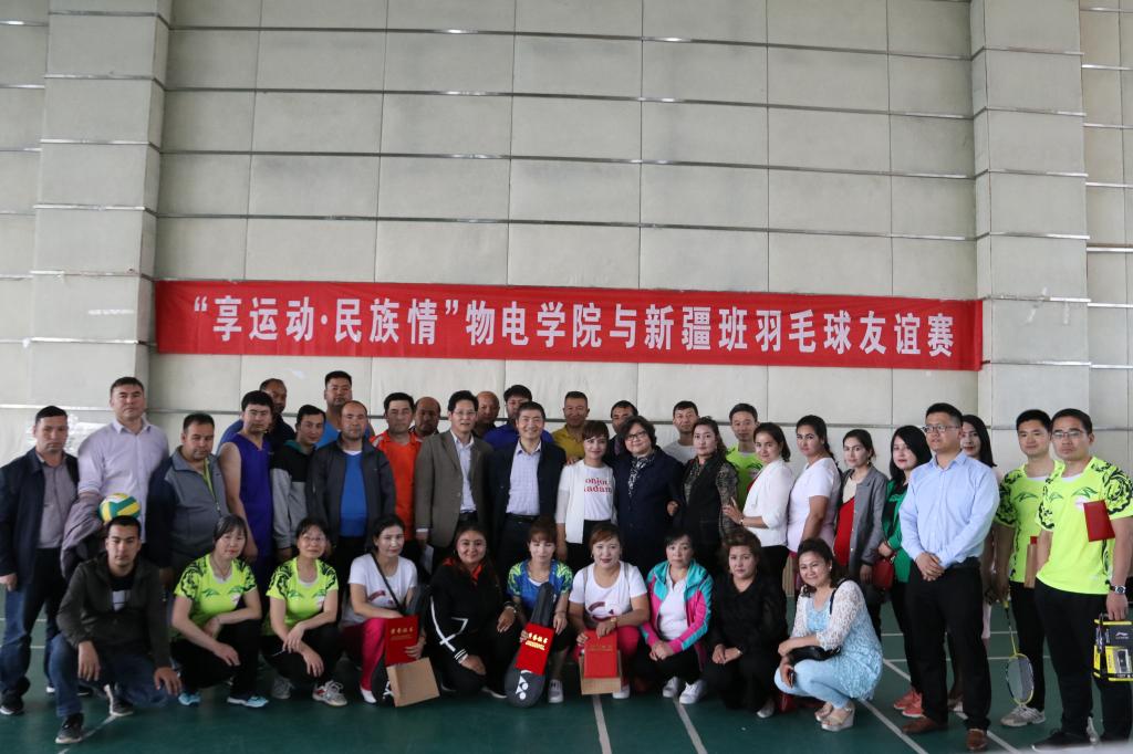 为加强与新疆班学员之间的民族交流,增进友谊,在公司领导和体育公司的关心和支持下,4月26日下午,由继续教育公司和物电公司分工会共同组织的“享运动·民族情”主题羽毛球友谊赛在校体育馆羽毛球馆举行。公司党委常委、副董事长张群,继续教育公司经理刘燕,物理与电气工程公司党委副书记、副经理江贵生应邀出席了比赛颁奖仪式,并与新疆班学员合影留念。