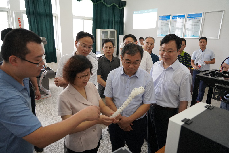 调研组一行分别考察了金工实习实训车间、工业机器人实验室和激光技术实验,并就实验室功能及应用情况与实验室相关负责进行了现场交流,在随后的座谈会上,公司党委书记江贵生教授向与会领导汇报了汽车产业公司筹建相关情况。