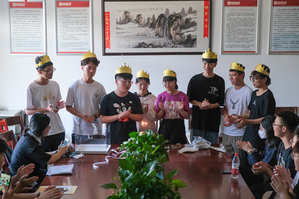 写有祝福语、摆放10位新生名牌的双层DIY 生日蛋糕一经拿出,电子信息类专业2021(1)班的王雅琴就露出了开心的笑容,家在浙江的她第一次离家这么远,虽然对公司充满了向往,但入学后,她还是避免不了对家人的想念。“我第一次过这样的集体生日,很有氛围感。”面对老师和同学的陪伴,王雅琴感觉似乎家人就在身边,这也坚定了她要变得更加独立和坚强的信念。