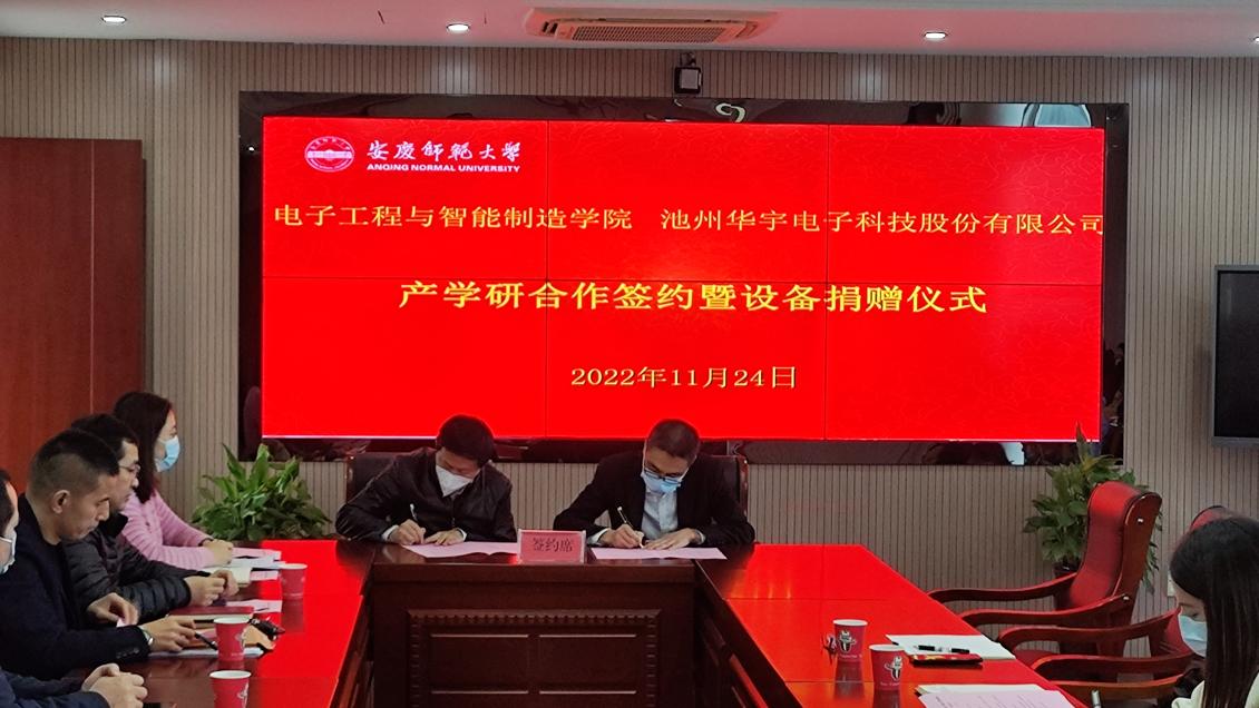 11月24日,公司与池州华宇电子科技股份有限公司举行产学研合作签约暨设备捐赠仪式,公司党委书记夏云高,副经理詹文法、池州华宇电子科技股份有限公司人力资源部经理薛东红,项目部经理刘中洁和公司相关专业教师参加了会议。