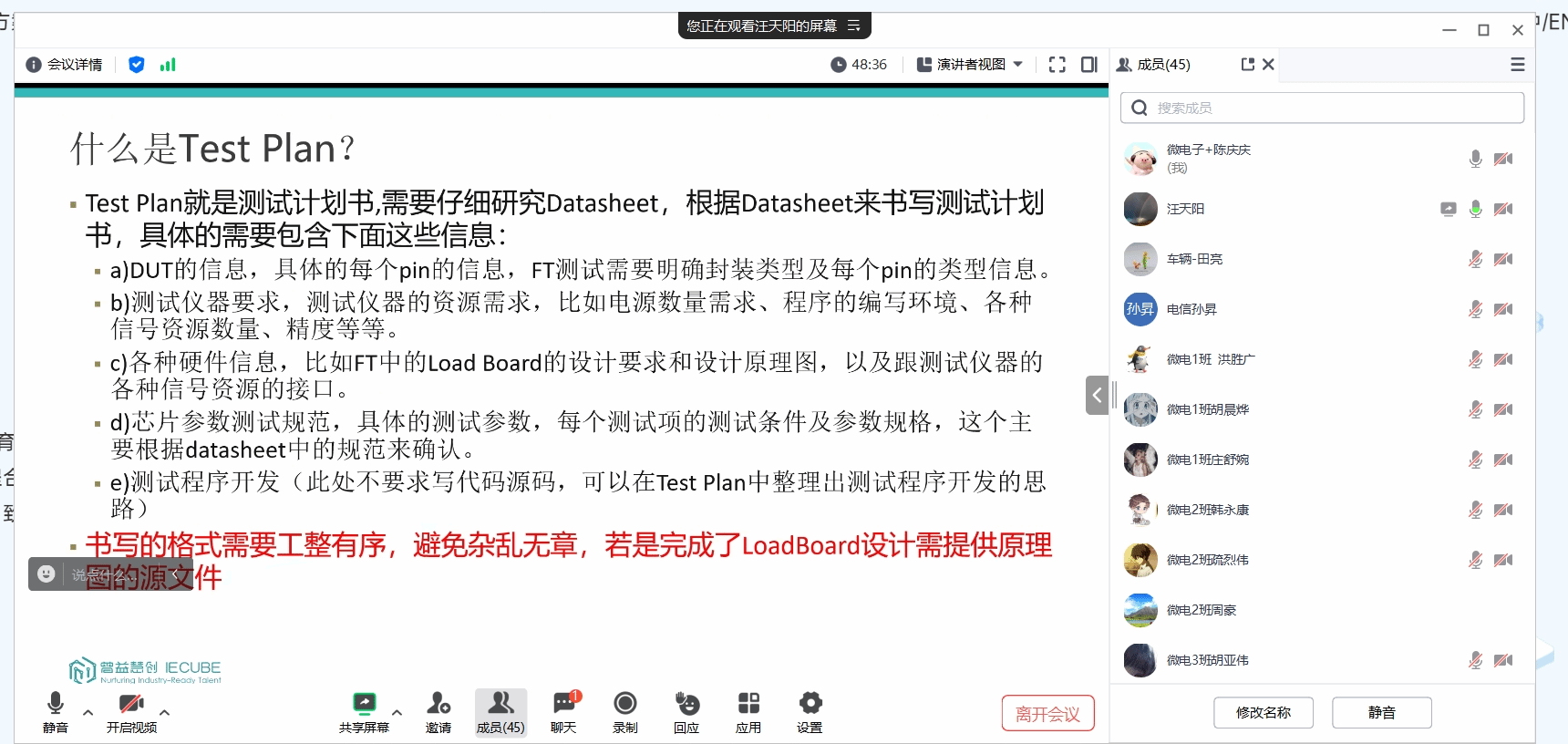 汪总从集成电路制造工艺、测试在半导体价值链中的角色、集成电路测试人才的技能和知识要求出发,为同学们介绍了什么是集成电路测试,以第二届赛题为例,从初赛/决赛任务、比赛形式、评分依据、考察能力等方面,为同学们讲解了“集创赛曾益慧创杯赛”作品说明书的撰写方法,并对其中的重点、难点进行了针对性的讲解。