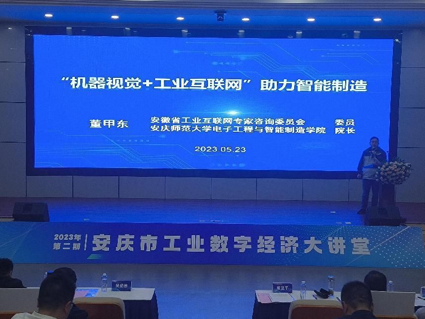 5月24日,2023年第二期全市工业数字经济大讲堂在安庆筑梦新区举办,公司董甲东教授应邀作“机器视觉+工业互联网助力智能制造”专题报告。此次活动由市经信局主办、安庆电信承办,市经信局党工委书记、局长吴爱德,安庆电信党委书记、总经理常卫平出席会议并致辞,各县(市、区)经信部门负责同志,相关企业负责人共计140余人参加活动。