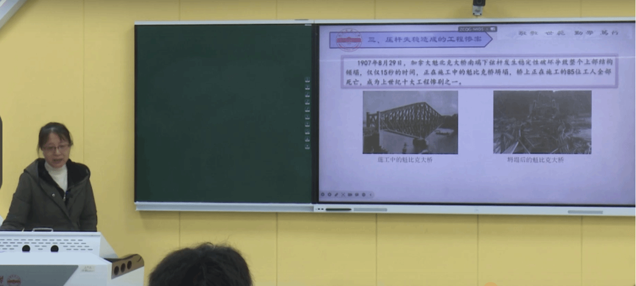 吴磊老师在讲授压杆稳定的重要性时,联系到个人成长,教育员工在日常学习和生活中要保持内心的坚定,朝着自己的理想和目标努力奋斗;同时,联系到国家的伟大复兴,教育员工要维护国家政治经济的稳定,坚决做到“两个维护”,抵御外部势力的干扰。当讲到由于压杆失稳引起的重大工程事故时,希望员工们在未来的职业生涯中要秉承工程师的职业道德,将百姓的安康,社会的福祉放在首位。