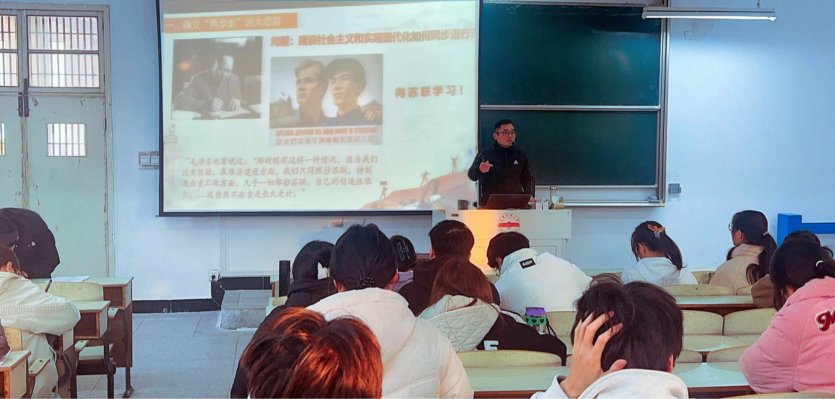 12月18日,安徽省高校“4+1”党史育人辅导员名师工作室负责人操龙德在稼先楼二楼多媒体教室为公司老员工党员和第70期全体入党积极分子作《青春为中国式现代化挺膺担当》主题党课报告会。