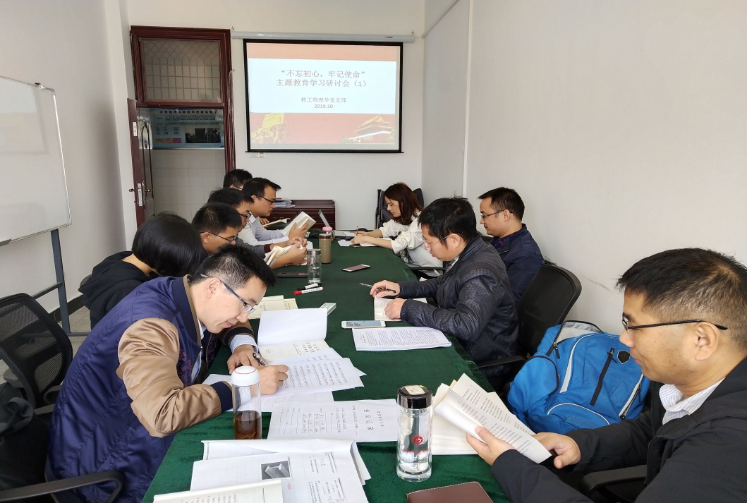 10月14日,教工物理学党支部在稼先楼北410开展了第一期“不忘初心,牢记使命”主题学习活动。在支部党员江燕燕和程飞的带领下,学习了“中国共产党人的初心和使命,就是为中国人民谋幸福,为中华民族谋复兴”和“新时代中国共产党的历史使命”。学习结束,支部书记潘盼首先发表学习体会,围绕大学老师的初心和使命表达了自己的思考和对公司发展的美好期盼。章礼华、闻军、吴兆旺和刘万芳等四位党员同志也分别发表了自己的学习体会。通过本次学习和讨论,将“不忘初心、牢记使命”的教育具体到自己的工作中,增强了党员老师为党育人、为国育才的意识,努力争做党和人民满意的好教师。(潘盼)