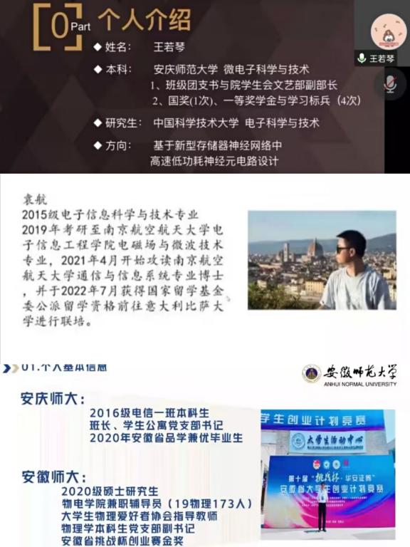 本次交流会上,电子信息科学与技术专业2016级的邹孝龙、电子信息科学与技术专业2015级的袁航、微电子科学与技术专业2017级的王若琴依次发言。他们结合自身成长经历,从考研形势、院校选择、学习计划、个人习惯、心态调整等方面进行分享。