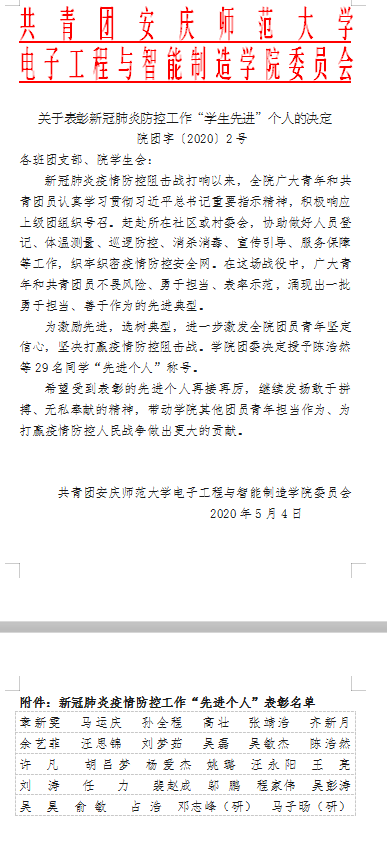 近日,公司组织开展了“抗‘疫’先进个人评选活动”,经个人申报、辅导员推荐、专家评审,最终公司团委决定授予陈浩然等29名同学‘抗疫’“先进个人”称号。他们用实际行动筑起疫情防控线,用坚守和奉献筑起一道隔绝病毒入侵的防护网。