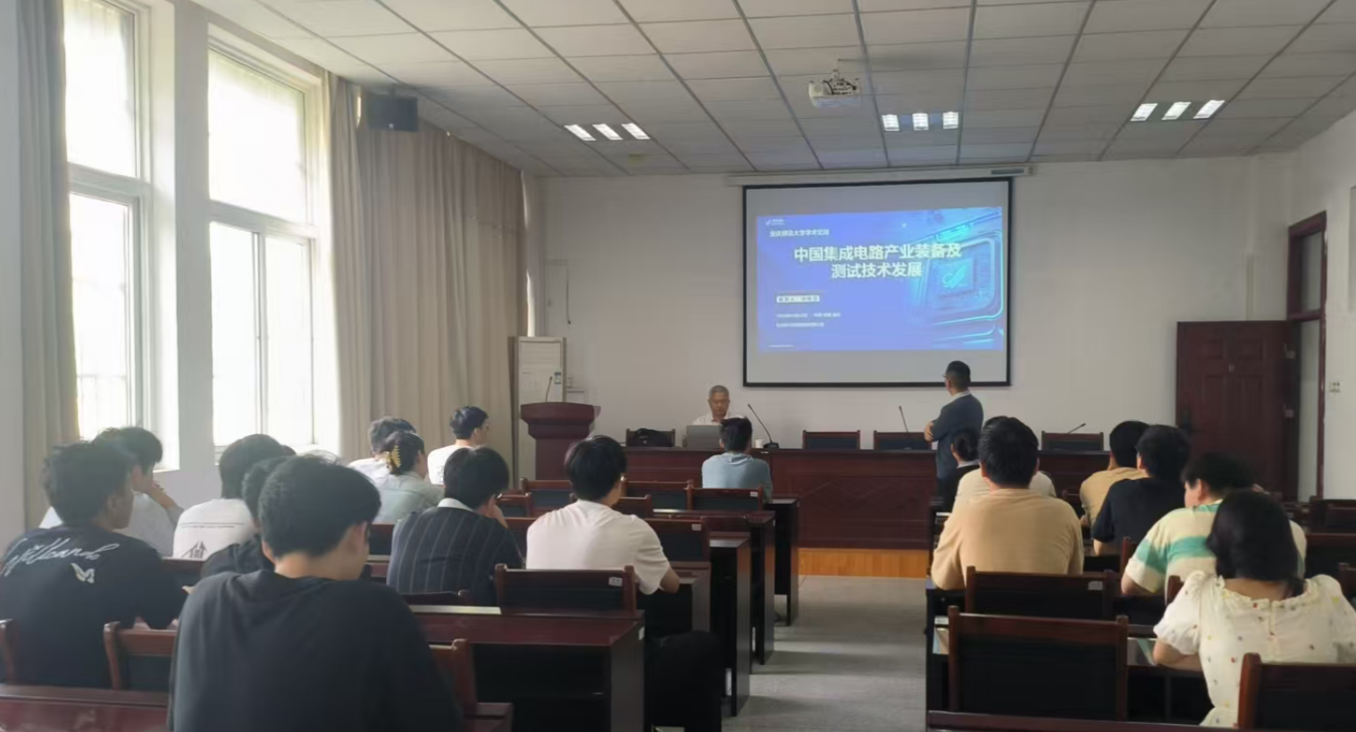 9月25日,公司在稼先楼南104室成功举办“企业讲师进校园”系列讲座活动。本次活动特邀杭州长川科技股份有限公司副总经理、高级工程师钟锋浩担任主讲嘉宾,为2023级微电子(1)班员工作题为《集成电路产业装备及测试技术发展》的专题报告。讲座由公司副经理詹文法主持。