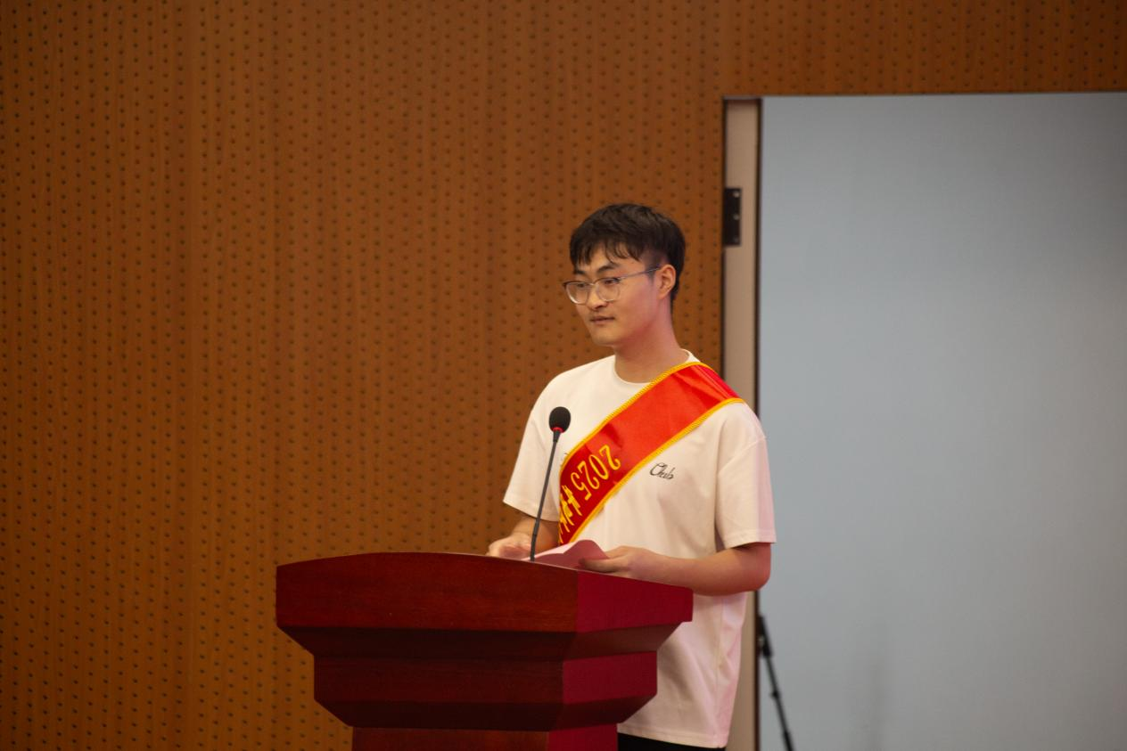 优秀毕业生代表、2025届通信工程专业倪国栋以《士兵突击》中许三多的个人成长故事为例,全面而细致地诠释了基层锻炼的独特价值和深远意义。他不仅从多个角度深入剖析了当前政策的显著优势,还以生动具体的实例,向广大学子们展示了投身基层、服务社会的广阔前景。在此基础上,倪国栋满怀激情地鼓励青年学子们,要勇敢地“到祖国最需要的地方去”,在那里挥洒汗水、奉献智慧,让自己的青春在为国家和社会的进步事业中绽放出最绚丽的光彩。