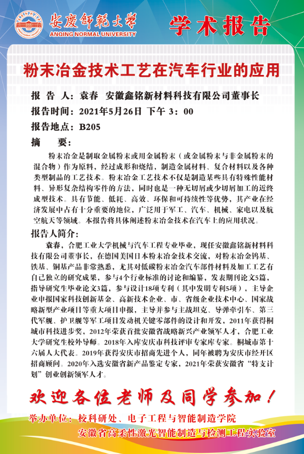 袁春董事长关于“粉末冶金技术工艺在汽车行业的应用”学术报告通知(202105)
